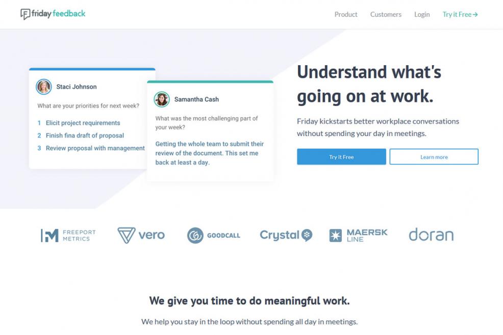 Friday Feedback is a software platform that streamlines communication across distributed teams in an organization. The platform includes modules to support daily stand up, 1-on-1 meetings, and weekly standups. The platform also provides metrics, recognition tools, and 360 degree assessments to provide insights into how an organization is performing. By utilizing the Friday Feedback platform, an organization can improve alignment to become more effective overall.